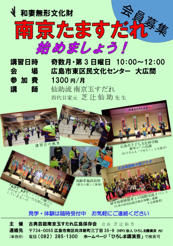 「ひろしま講演芸」はNPO法人として、「古典芸能南京玉すだれ広島保存会」と「安芸奇術同好会」を主宰しています。