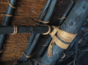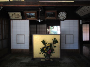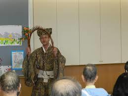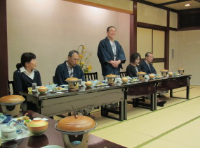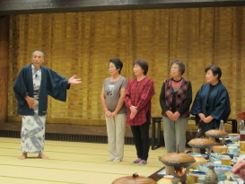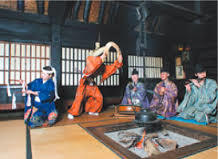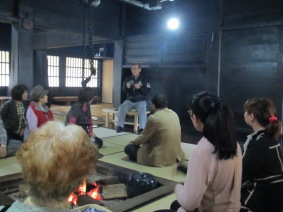 囲炉裏を囲んで当主より「こきりこ」を披露