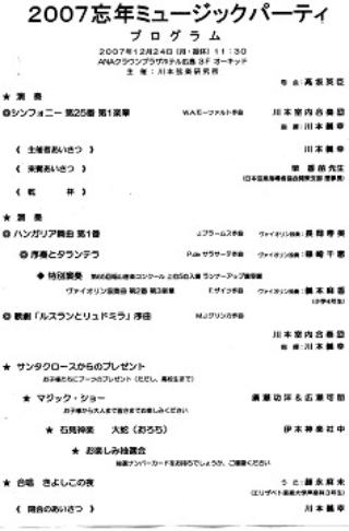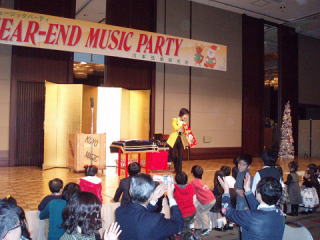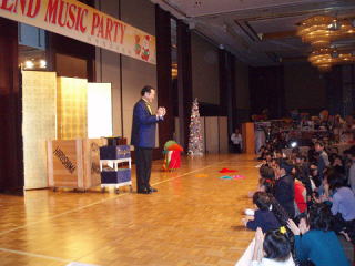 川本弦楽研究所は毎年この時期に「忘年ミュージックパーティー」を開かれているが、年々参加者が増し、今年も330名の参加者で賑わった。司会は高坂英臣氏で巧みな話術で進行され参加者から好評を得ている。内容は下記のプログラムの内容で、同研究所のプロ講師の弦楽演奏、廣瀬功洋&広瀬可朋の楽しいマジック、伊木神楽社中の石見神楽、そして待望の大お楽しみ抽選会(景品内容、数とも中途半端ではない)私は、連続約20年参加させて頂いていますが、残念なことに数少ないはずれ組みになっている。今年こそは一番良い景品を目指し参加したいと思っている。
