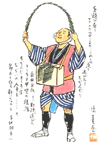太さ約5mm、長さ30cmの竹棒56本 を麻糸で編んで作られており「伸ばす、返す、捻る」の三つの動作で、5種類(入門編)、9種類(基本演技)を作る見立て芸です。 「仙助流 南京玉すだれ」は江戸時代に吉田仙助氏により、玉すだれを村歌舞伎に取り入れ、現在舞台芸として確立した正統派の団体で、平成9年5月には公益社団法人日本奇術協会の「和妻」の仲間として無形文化財に認められています。